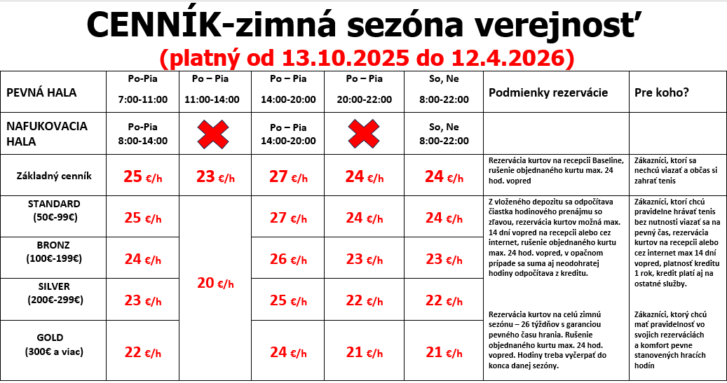 Upozorňujeme ctených zákazníkov, že všetky rezervácie športovísk, ústne, telefonické či webové, sú záväzné. V prípade, že sa záujemca nedostaví na svoju rezerváciu a lebo ju nezruší min. 24 hod. vopred, bude mu rezervácia zaúčtovaná a lebo stiahnutá z depozitu!!!