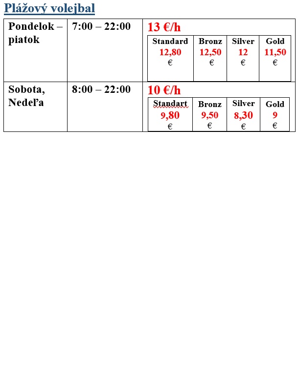 Plážový volejbal sa v športovom areáli BASELINE hrá na jednom kvalitnom dvorci vždy od konca apríla (podľa počasia) do konca septembra.